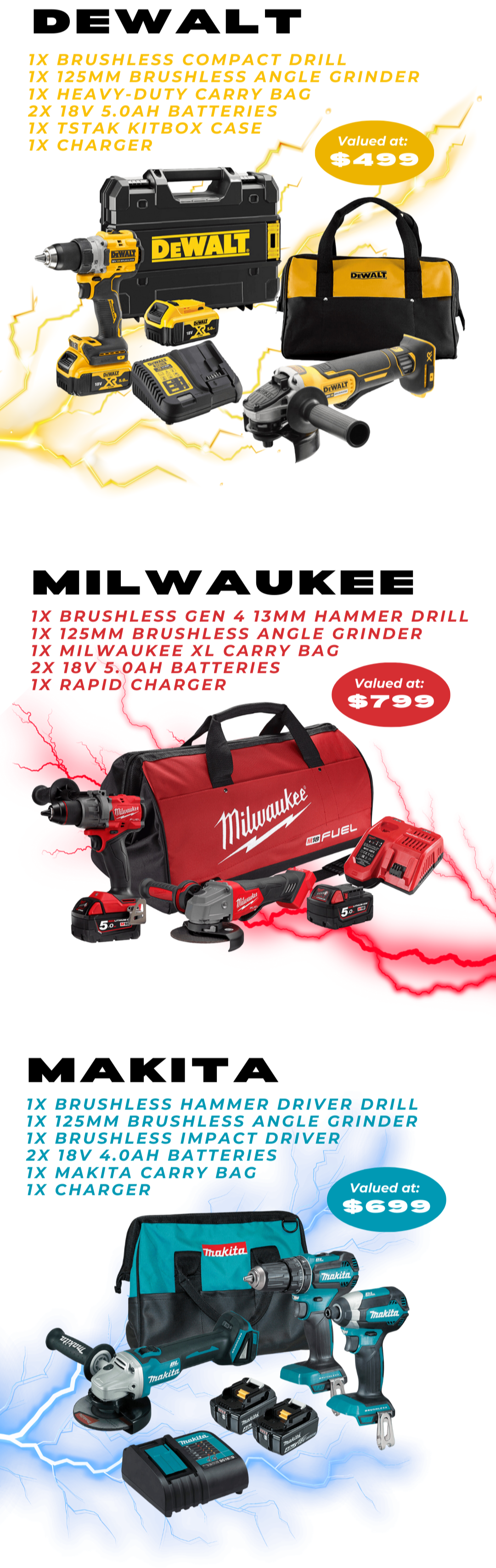 Get ready to power up your gear! When you grab a Tradie Charger, you’re automatically in the running to win an epic toolkit of your choice. We’re giving away just one, but you get to pick from three premium setups, each packed with the high-performance tools every tradie dreams of!